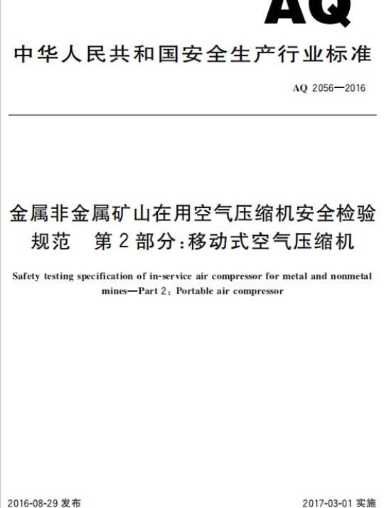AQ 2056-2016.Safety testing specification of in-service air compressor for metal and nonmetal mines- Part 2: Portable air compressor.