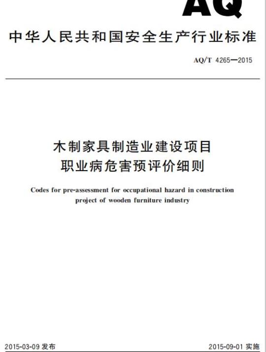 AQ/T 4265规定了木制家具制造业建设项目职业病危害预评价的目的和基本原则、评价依据、评价范围、主要评价方法、评价程序、前期准备、评价的实施和报告书的编制要求等。