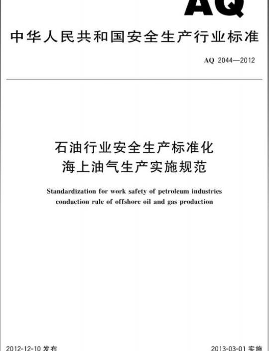 AQ 2044规定了在中华人民共和国的内水、领海、毗连区、专属经济区、大陆架,以及中华人民共和国管辖的其他海域内从事海洋石油天然气开采活动的海上油气生产单位创建安全生产标准化的具体要求。