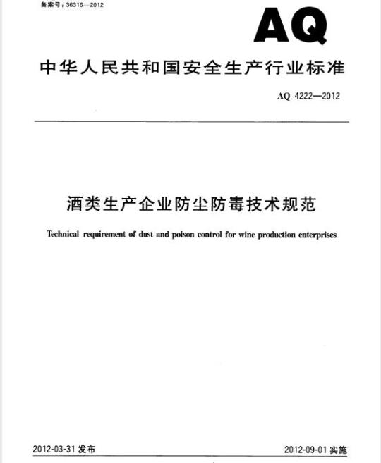 AQ 4222规定了酒类生产企业防尘防毒的基本要求、技术措施和管理。