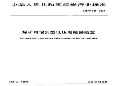 本标准适用于煤矿用增安型低压电缆接线盒(以下简称接线盒)。 MT/T 945-2005 煤矿用增安型低压电缆接线盒 MT/T945-2005 标准下载解压密码:www.bzxz.net