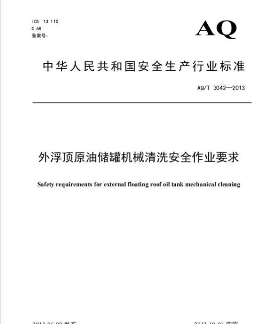 AQ/T 3042规定了外浮顶原油储罐机械清洗安全作业的一-般要求和工艺要求。