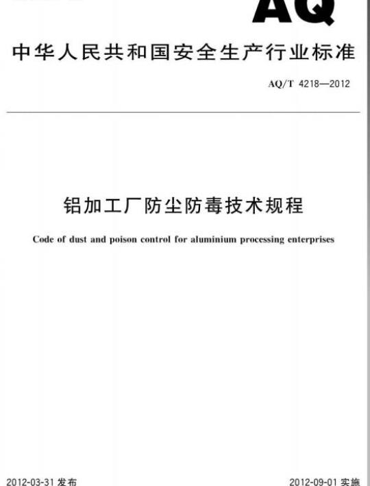 AQ/T 4218适用于铝加工厂防尘防毒的工程设计、铝加工厂“生产过程的防尘防毒技术和管理。