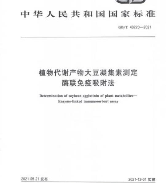 GB/T 40220规定了植物代谢产物大豆凝集素的酶联免疫吸附测定方法。