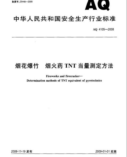 AQ 4105-2008.Fireworks and firecracker-Determination methods of TNT equivalent of pyrotechnics.