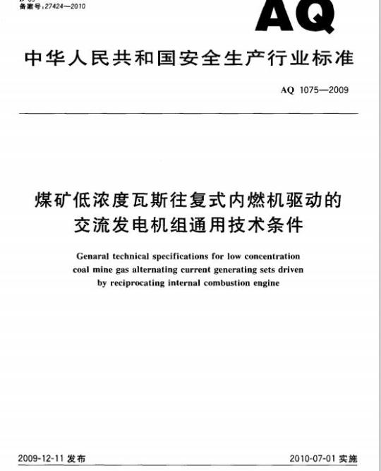 AQ 1075-2009.Genaral technical specifications for low concentrationcoal mine gas alternating current generating sets driven by reciprocating internal combustion engine.