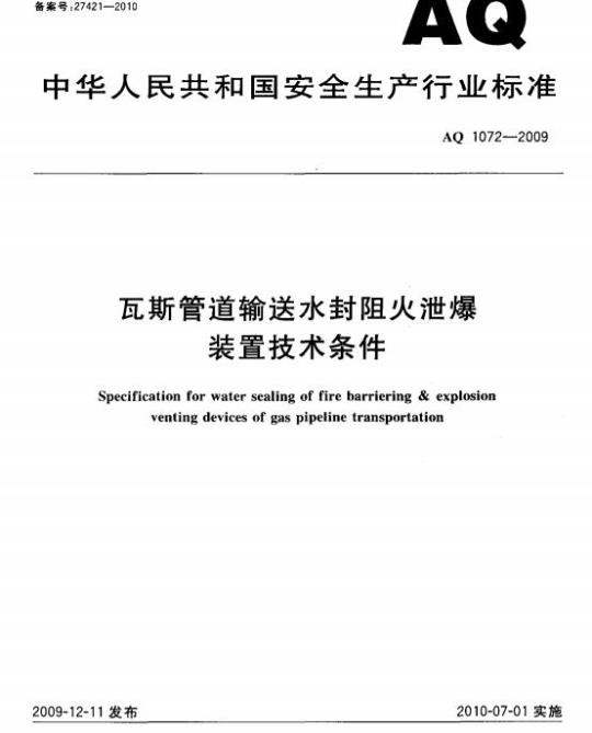 AQ 1072-2009.Specification for water sealing of fire barriering & explosion venting devices of gas pipeline transportation.