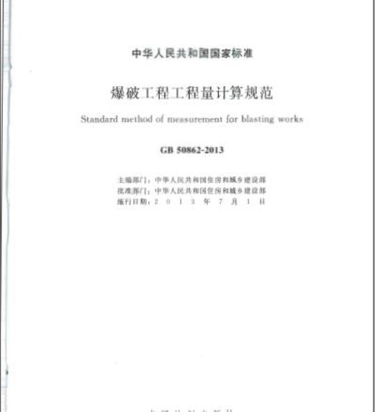 住房城乡建设部关于发布国家标准《爆彼丁程工程量计算规范》的公告现批准《爆破「程「程量计算规范》为国家标准,编号头GB 50862一2013,白 2013 年 7 月 1 起实施。其中,第 1.0.3、4.2.1、4.2.2、4.2.3、4.2.44.2.5、4.2.6、4.3.1条(款)为制性条文,必须严格执行。