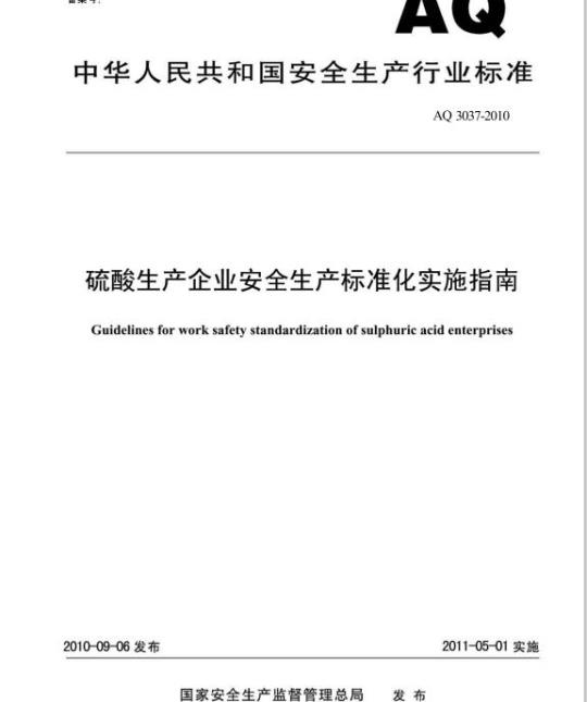 硫酸生产企业安全生产标准化实施指南本标准规定了硫酸生产企业(以下简称企业)开展安全生产标准化的过程和要求。AQ3037-2010