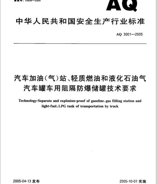 AQ 3001规定了采用阻隔防爆技术的汽车加油(气)站和汽车运输用轻质燃油、液化石油气阻隔防爆储罐(罐体)的分类和标记、要求、检测方法、检验规则和技术文件。