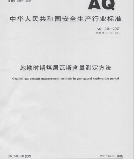 AQ 1046适用于在煤层地质勘探钻孔中采取煤芯测定煤层瓦斯含量及瓦斯成分。