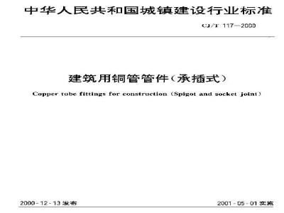本标准规定了建筑用铜管等径三通接头、铜管45°弯头、铜管90°弯头、铜管异径接头、铜管套管接头、铜管管帽的基本参数、结构尺寸、要求、试验方法、检验规则和标志、包装、运输、贮存。本标准适用于冷水、热水、制冷、供热(≤135℃高温水)、燃气、医用气体等管路系统,其他管路亦可参照使用。 CJ/T 117-2000 建筑用铜管管件(承插式)CJ/T117-2000 CJ/T117-2000 标准下载解压密码:www.bzxz.net