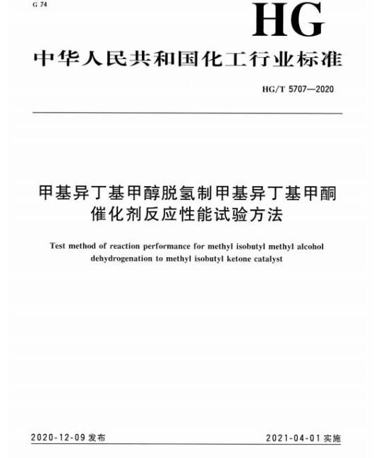 HG/T 5707适用于以铜、锌、铝为主要活性组分,以共沉淀法制备的甲基异丁基甲醇脱氢制甲基异丁基甲酮催化剂。