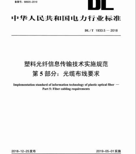 DL/T 1933.5规定了电力通信塑料光纤工程综合布线的系统设计、系统配置、系统指标、安装工艺要求、防火要求。