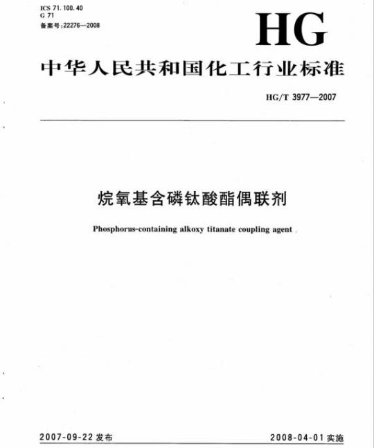 HG/T 3977适用于以正钛酸四异丙酯、2-乙基己醇、五氧化二磷或亚磷酸为主要原料合成的烷氧基含磷钛酸酯偶联剂。