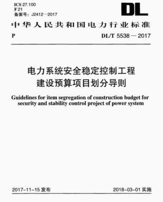 Guidelines for item segregation of construction budget forsecurity and stability control project of power systemDL/T5538-2017