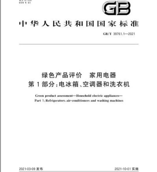 GB/T 39761.1适用于家用和类似用途的电冰箱、空调器、洗衣机的绿色产品评价。