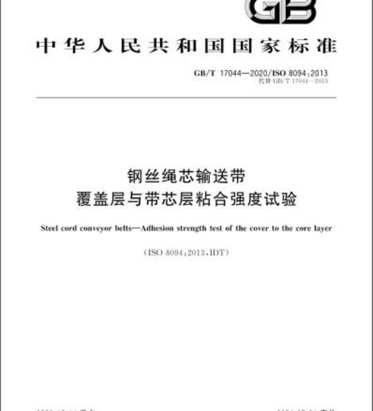 GB/T 17044规定了钢丝绳芯输送带覆盖层与带芯层之间粘合强度的试验方法。