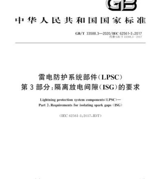 GB/T 33588.3规定了雷电防护系统的隔离放电间隙(ISG)的要求和试验方法。