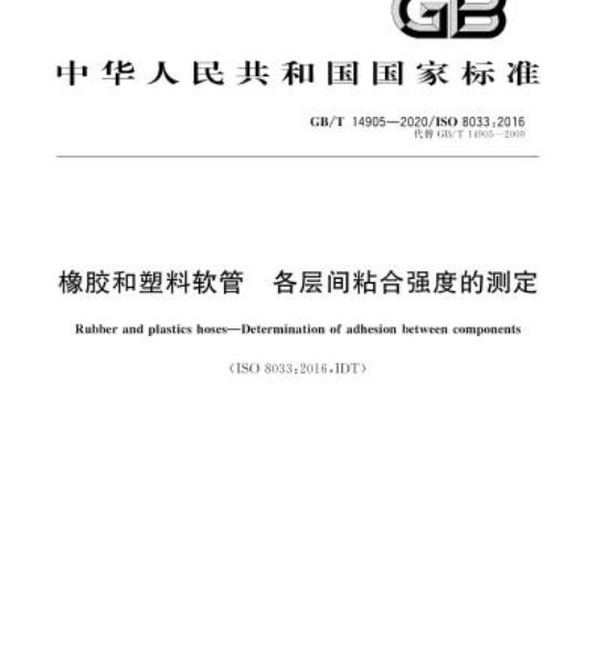 GB/T14905—2020/ISO8033:2016橡胶和塑料软管各层间粘合强度的测定软管各层间充分的粘合是软管在使用期间能否良好工作的基础。本标准规定了软管内衬层和增强层、外覆层和增强层、增强层间、外覆层和外贴层(位于外覆层之外起保护作用的薄层)以及内衬层和镀衬层(位于内衬层内·降低流体对内衬层渗透作用的薄层)之间的粘合强度的测定方法,本标准包含所有尺寸的软管并包含以下型别的软管结构:机织织物;
