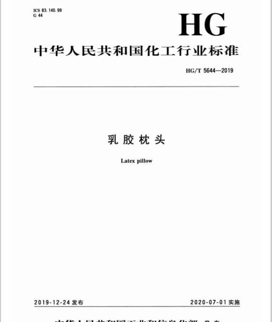 HG/T 5644适用于由天然胶乳、合成胶乳或由天然胶乳与合成胶乳两者并用的混合胶乳加入配合剂经发泡、硫化等工艺制备的乳胶枕芯与枕套组成的乳胶枕头(以下简称“枕头”)。