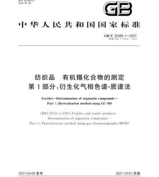 GB/T20385\纺织品有机锡化合物的测定》按照不同的测试方法拟由以下两个部分构成:第1部分:衍生化气相色谱-质谱法。第2部分:液相色谱法。