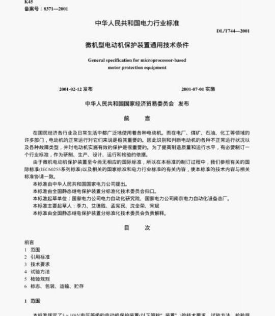 在国民经济各行业及日常生活中都广泛地使用看各种电动机。而在电厂,煤矿、石油、化工等领域的许多部门,电动机的正常运行对它们来说是极其重要的。因此识别和判断电动机的各种不正常运行状况以及各种故障类型,并对电动机实施有效的保护是很重要的。为了提高制造质量和运行水平,有必要制订一个行业标准,作为研制、生产、设计、运行和检验的依据。由于微机电动机保护装置至今尚无相应的国际标准,所以在本标准的制订过程中,我们参照有关的国际标准(IEC60255系列标准)以及相关的国家标准和电力行业标准的有关内容,使本标准的技术内容与相关标准协调一致。