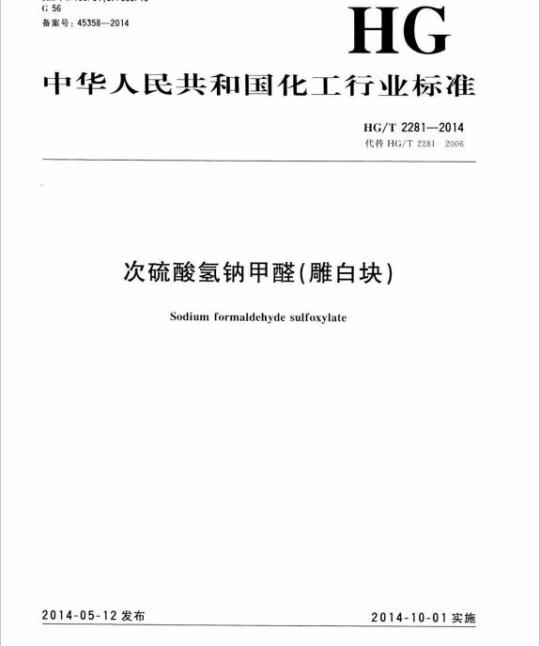 本标准按照GB/T1.12009标准化工作导则第1部分:标准的结构和编写》给出的规则起草。本标准代替HG/T22812006《次硫酸氢钠甲醛(雕白块)》,与HG/T22812006相比除编辑性