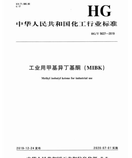 HG/T 5627适用于以丙酮为原料在催化剂作用下加氢缩合制得的工业用甲基异丁基酮(MIBK).