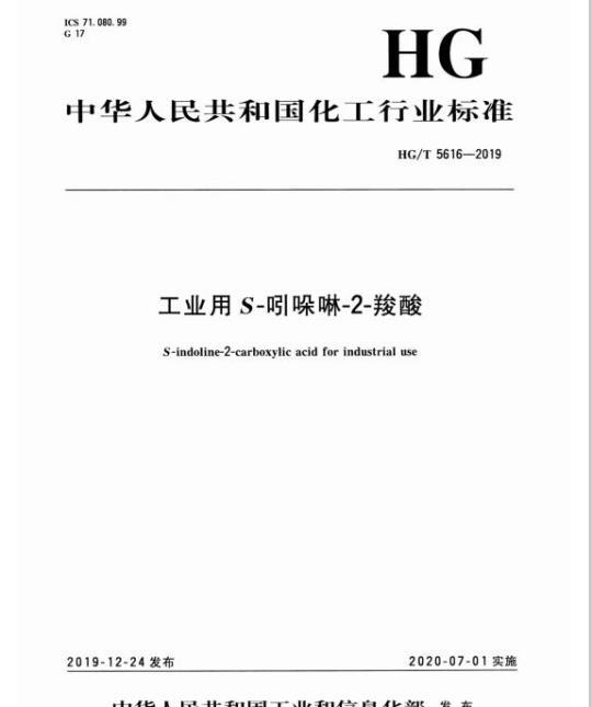 HG/T 5616适用于以吲哚-2- 甲酸为主要原料,经酰化、加氢、拆分等工序制得的工业用S吲哚啉-2-羧酸。