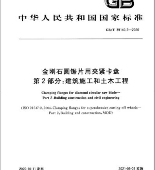 GB/T 39140.2适用于切割建筑和土木工程材料.安装在固定式切割机、移动式切割机和手持式切割机上的金刚石圆锯片用夹紧卡盘。