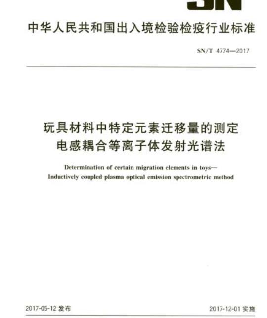 SN/T 4774规定了电感耦合等离子体发射光谱法(ICP-OES)测定玩具材料中铝、锑、砷、钡、硼、镉、铬、钴、铜、铅、锰、汞、镍、硒、锶、锡、锌17种元素迁移量的方法