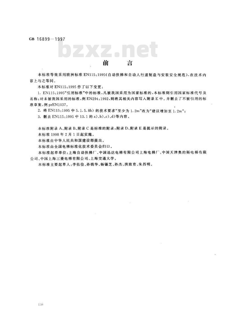 本标准由中华人民共和国建设部提出。本标准由全国电梯标准化技术委员会归口。本标准起草单位:上海自动扶梯厂,中国迅达电梯有限公司上海电梯厂、中国天津奥的斯电梯有限公司、中国上海三菱电梯有限公司、上海交通大学。本标准主要起草人:李佑俭、孙钱华、杨锡芝、孙杰、洪致育、朱昌明。136