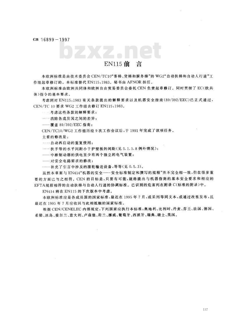 -补充了引言中涉及的滚轮输送设备,等等(见0.5.3)。虽然本草案与EN414“机器的安全-安全标准制定和撰写的规程”并不完全相致,但在很多重要的方面已与之相符。CEN的目标是,只要有可能,就将提出与机器指南的基本安全要求和相应的EFTA规程相符的自动扶梯与自动人行道的协调标准。已识别的危害列在附录C(标准的附录)中。EN414将在EN115的下次版本中考虑。本欧洲标准应是各成员国的国家标准,最迟在1995年7月,或采用等同文本,或通过改签发布,且最迟在1995年7月应收回与此相抵触的国家标准。根据CEN/CENELEC内部规定,下列国家应执行本标准:奥地利、比利时、丹麦、芬兰、法国、德国、希腊、冰岛、爱尔兰、意大利、卢森堡、荷兰、挪威、葡萄牙、西班牙、瑞典、瑞士、英国。137