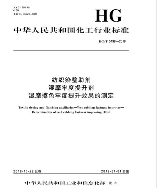 HG/T 5498适用于纺织染整助剂中深色棉织物湿摩牢度提升剂湿摩擦色牢度提升效果的测定。