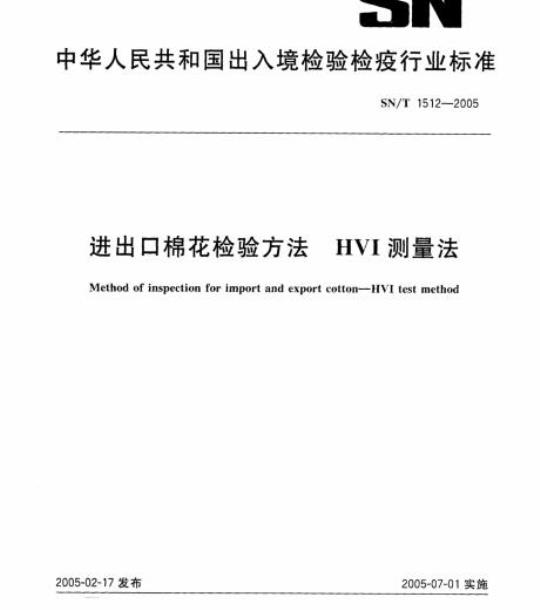 SN/T 1512规定了用HVI检验进出口棉花的马克隆值、长度及均匀度.断裂强度和伸长.颜色、杂质的检验方法和技术要求。