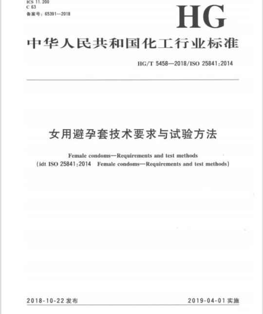 HG/T5458—2018/ISO25841:2014女用避孕套是一种能完全覆盖阴道腔的鞘套,在性交时和阴茎抽出后保留在阴道内,用于防止意外妊娠和性传播疾病(STIs)。女用避孕套有别于男用避孕套,它在阴签抽出后保留在阴道内。它的外部固定部件能够部分覆盖女性外生殖器。无针孔完好的聚合物搏膜可起到有效阻隔人类免疫缺陷病毒(HIV)以及其他性传播疾病的传染介质和精子的作用。用聚合物薄膜制造的女用避孕套可有效避孕,并可预防性传播疾病感染。为确保其有效,女用避孕套应能够完全置于阴道腔内,无针孔,无缺陷,具有足够的物理性能以便在使用中不会破裂,使用正确的包装保护储存期内的产品,采用恰当的标识方便消费者使用为确保安全,在正常储存或使用过程中,女用避孕套及其所使用的任何润滑剂、添加剂、数料、单个包装材料或粉末应既不含有也不释放足以产生毒性,造成过敏,局部刺激或其他危害的物质。女用避孕套为非无菌医疗器械,制造商应采取适当的预防措施,将产品在生产和包装过程中产生的微生物污染降至最小,为了确保高品质,女用避孕套应在良好的质量管理体系下进行设计和生产,可参考GB/T19000,GB/T19001,GB/T19004,ISO13485和ISO14971。制造商在产品投放市场前应对新的或改良的女用避孕套进行稳定性试验,以估测其储存期,以此保证制造商拥有足够的数据支持其声称的储存期,管理方、第三方实验室和购买方能够获得这些数据并对其进行评审,同时也是为了减少第三方进行长期稳定性研究的必要。在产品投放市场前也应对产品进行真实时间储存期研究,但该项不需要在产品投放市场前完成。由于女用避孕套是一类相对较新的器械,不同产品的设计也大不相同,有必要开展临床试验以继续寻找其安全性及有效性的证据。这些研究可以对女用避孕套内部和外部固定部件的整体性能,失效模式、安全性及有效性进行评估。本标准所列内容为最低技术要求和试验方法。新设计可能要求更加严格的固定部件和其他特性,或要求制造商对规格和试验方法重新进行定义。所有这些问题在本标准中均有涉及。m