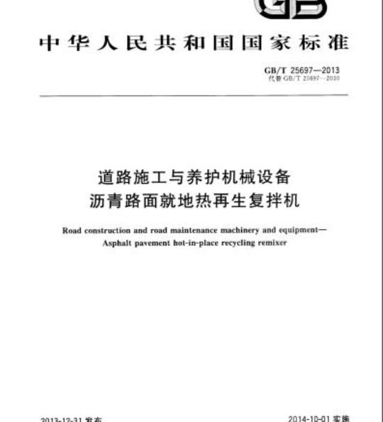 GB/T 25697规定了沥青路面就地热再生复拌机(以下简称复拌机)的术语和定义、产品分类.技术要求、性能试验、可靠性试验、检验规则、标志、包装、运输、贮存等。