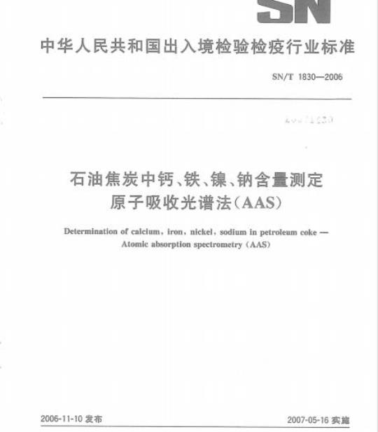 SN/T 1830规定了原子吸收光谱法测定未煅烧或已煅烧石油焦炭中钙、铁、镍、钠含量的方法。