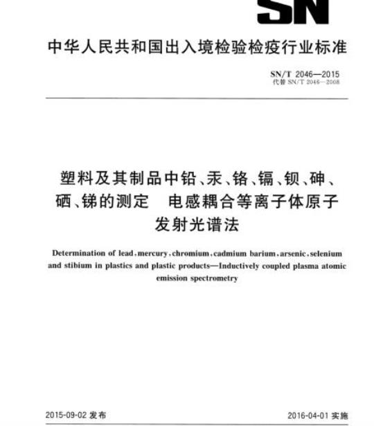 SN/T 2046规定了电感耦合等离子体原子发射光谱法测定塑料及其制品(聚氟塑料除外)中铅(Pb)、汞(Hg)、铬(Cr)、镉(Cd) 、钡(Ba)、砷(As) 、硒(Se)和锑(Sb)含量的方法。