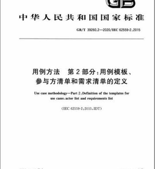 GB/T39260《用例方法》目前分为以下部分:GB/T39260.2—2020/IEC62559-2:2015第2部分:用例模板、参与方清单和需求清单的定义。本部分为GB/T39260的第2部分。本部分按照GB/T1.1一2009给出的规则起草。本部分使用翻译法等同采用IEC62559-2:2015《用例方法第2部分:用例模板、参与方清单和需求清单的定义》。