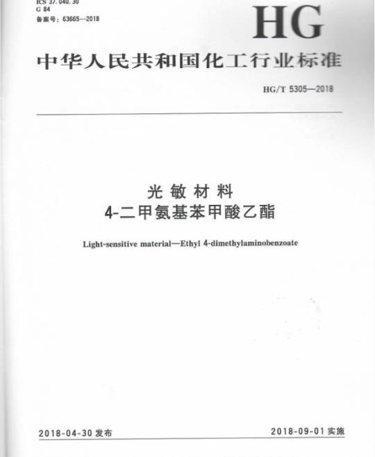 HG/T 5305规定了光敏材料4-二甲氨基苯甲酸乙酯(简称EDB)的要求、试验方法、检验规则、标