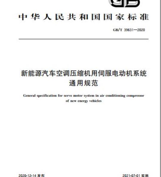 GB/T 39631规定了新能源汽车空调压缩机用伺服电动机系统的术语和定义、运行条件、型式与接口、技术要求和试验方法、检验规则、交付准备。