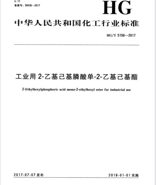 HG/T 5156适用于由三氯化磷与2-乙基己醇酯化反应,经酯化、缩合、精馏、水解、酸化制得的2-乙基己基膦酸单-2-乙基己基酯(P-507).