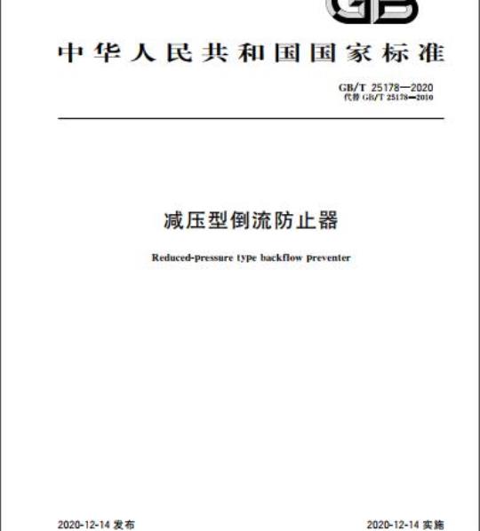 GB/T 25178规定了减压型倒流防止器的术语和定义,分类、型号标记,材料和结构,要求,试验方法,检验规则,标志、包装和贮运。