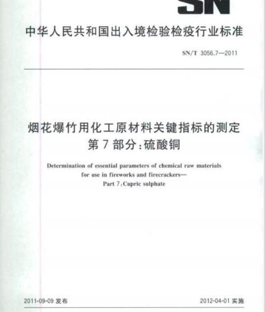 SN/T 3056.7适用于烟花爆竹用硫酸铜中铜含量的测定铁含量的测定、水下溶物含量的测定和pH值的测定。