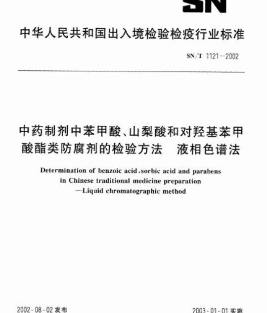 SN/T 1121规定了中药合剂、糖浆剂的抽样、制样方法,以及中药合剂、糖浆剂中苯甲酸、山梨酸、对羟基苯甲酸甲酯、对羟基苯甲酸乙酯、对羟基苯甲酸丙酯和对羟基苯甲酸丁酯的液相色谱法测定方法。