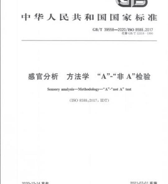 GB/T39558—2020/ISO8588:2017感官分析方法学“A”“非A”检验本标准规定了一种判别两类产品之间是否存在感盲差异的方法。该方法适用于单一或多个感官属性的差异判别。