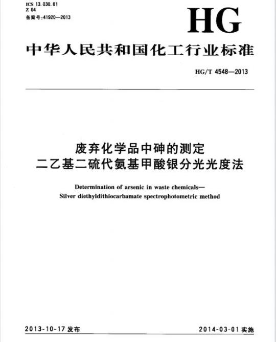 HG/T 4548适用于废弃化学品中砷含量的测定,适合于全部试液或所取试验溶液中含砷(As)的量为