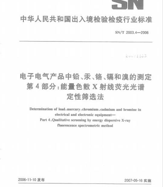 SN/T 2003.4规定了用能量色散X射线荧光光谱法定性筛选电子电气产品中铅、汞、铬、镉和溴的测定方法。